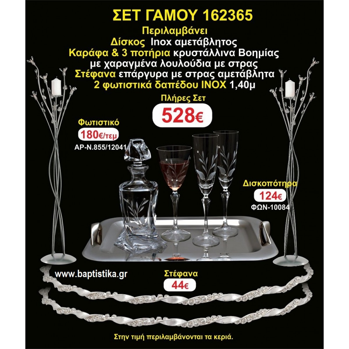 Η τιμή περιλαμβάνει 2 φωτιστικά δαπέδου (ινοξ,μπρονζέ η σκουριά) στέφανα επάργυρα αμετάβλητα,δίσκος ινοξ αμετάβλητος,μποτίλια κρυστάλλινη,3 ποτήρια κρυστάλλινα και ΦΠΑ