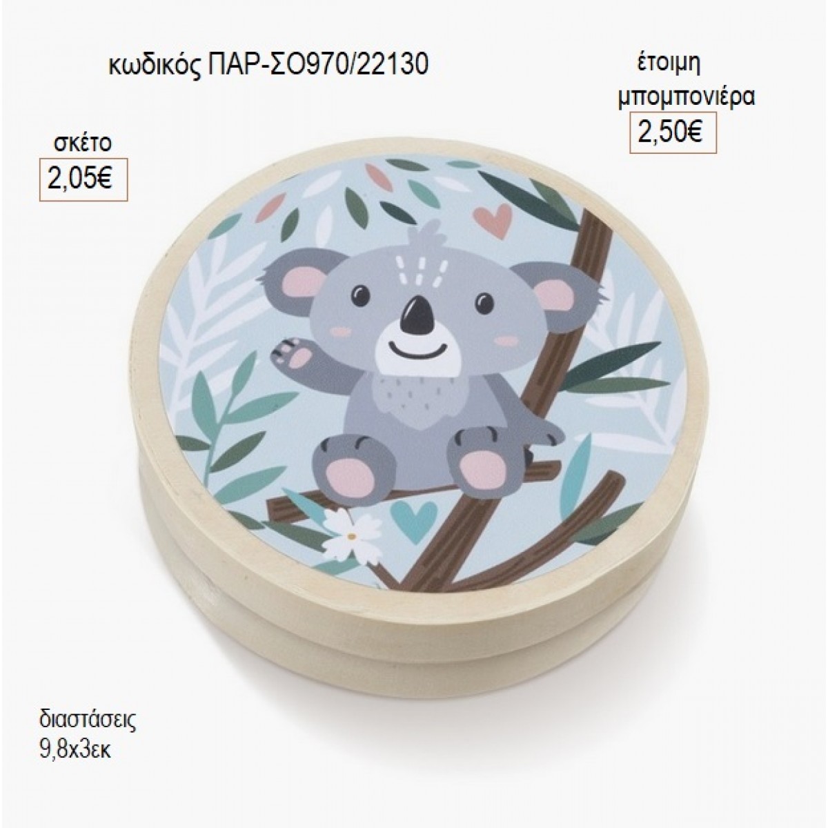 ΚΟΑΛΑ ΣΤΡΟΓΓΥΛΟ ΞΥΛΙΝΟ ΚΟΥΤΑΚΙ ΜΕ ΑΥΤΟΚΟΛΛΗΤΟ για μπομπονιέρες γούρι δώρο ΠΑΡ-ΣΟ970/22130 2.05€!!!