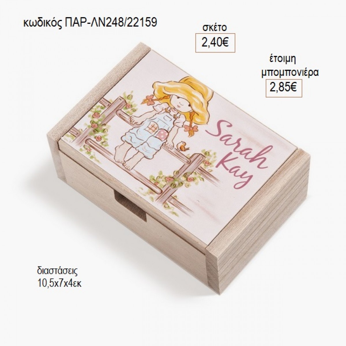 SARAH KAY ΑΥΤΟΚΟΛΛΗΤΟ ΣΕ ΞΥΛΙΝΟ ΚΟΥΤΙ για μπομπονιέρες γούρι δώρο ΠΑΡ-ΛΝ248/22159 2.40€!!!