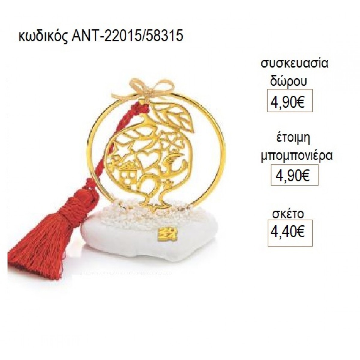 Μπορείτε να το ζητήσετε ως έτοιμη μπομπονιέρα με άριστο δέσιμο με κρυσταλιζέ τούλι 24χ24εκ.και 5 κουφέτα αμυγδάλου ή 5 κουφέτα πικολίνο (σοκολάτας) ή 15 σμάρτυς και 2 κορδέλες σατέν 0.03εκ.