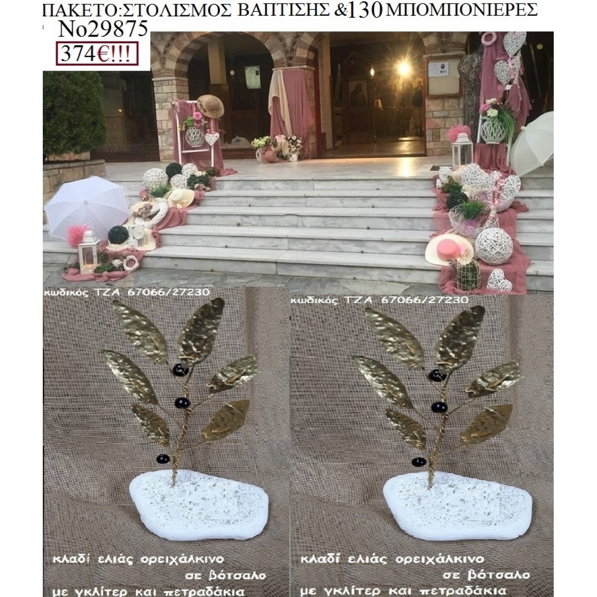 VINTAGE πακέτο βάπτισης (130 μπομπονιέρες & στολισμός εκκλησίας) Νο29875