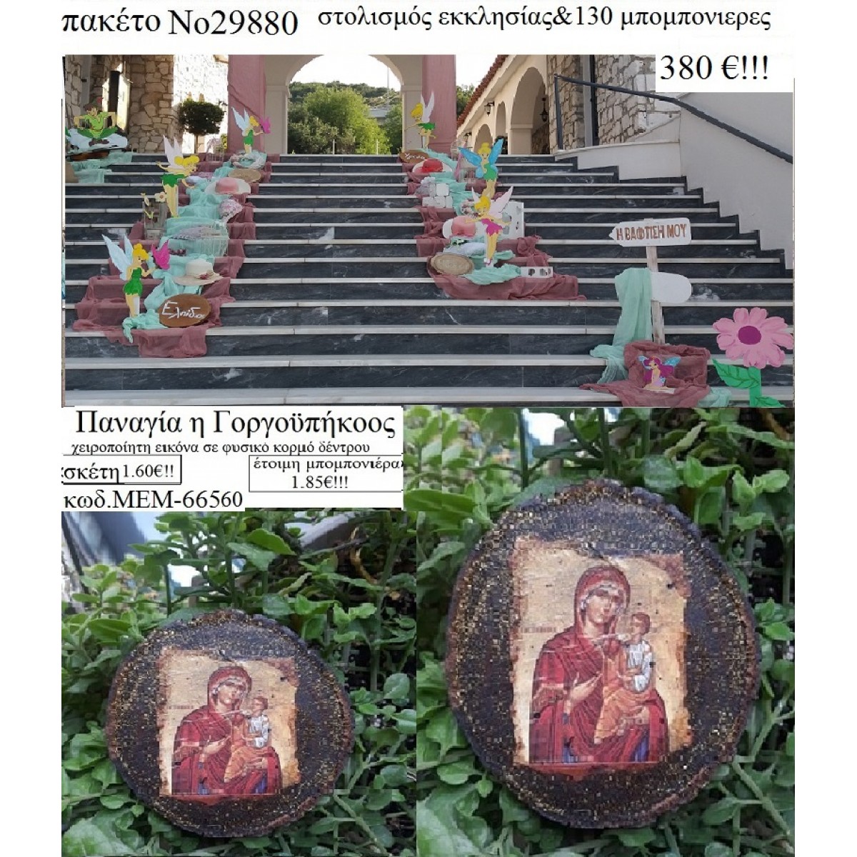 ΤΙΝΚΕΜΠΕΡΛ στολισμός εκκλησίας & 130 μπομπονιέρες ξύλινες εικόνες χειροποίητες 29880 380,00€