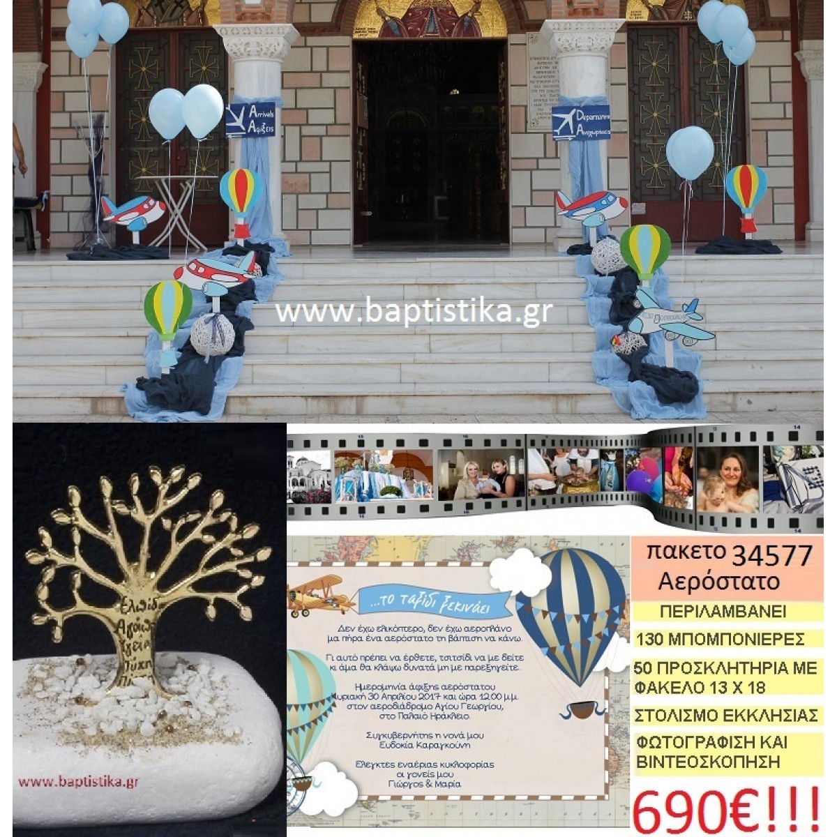 ΑΕΡΟΣΤΑΤΟ πακέτο βάπτισης (130 σε βότσαλο μπομπονιέρες,50 προσκλητήρια,στολισμός εκκλησίας,φωτογράφιση,βιντεοσκόπιση) Νο 34577
