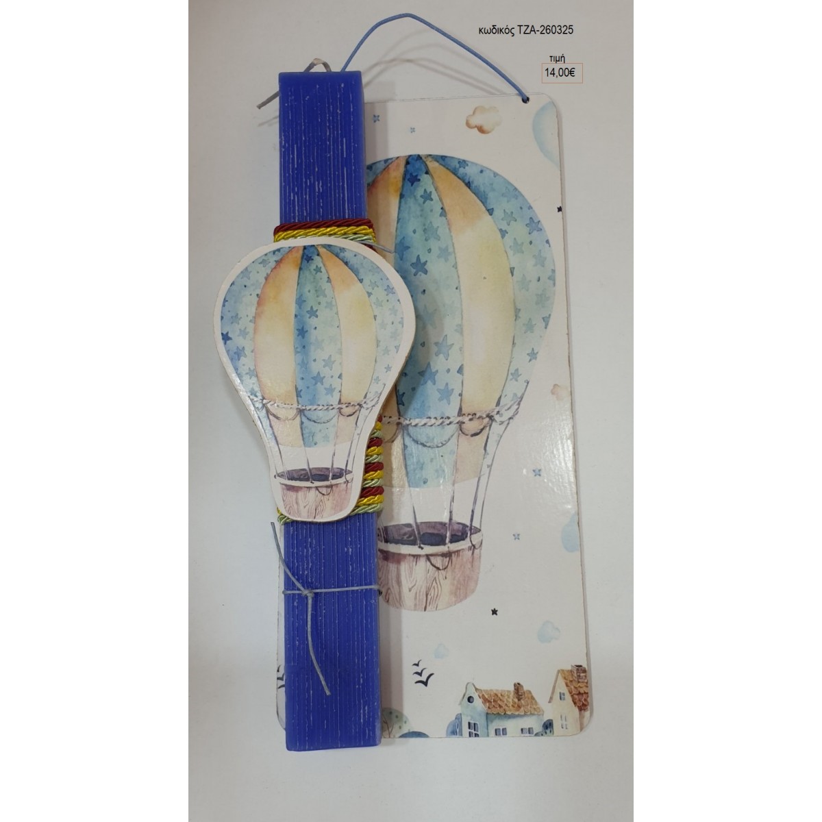Η λαμπάδα είναι διακοσμημένη με ξύλινο διακοσμητικό σε ξύλινο πλάτη με το ίδο θέμα.