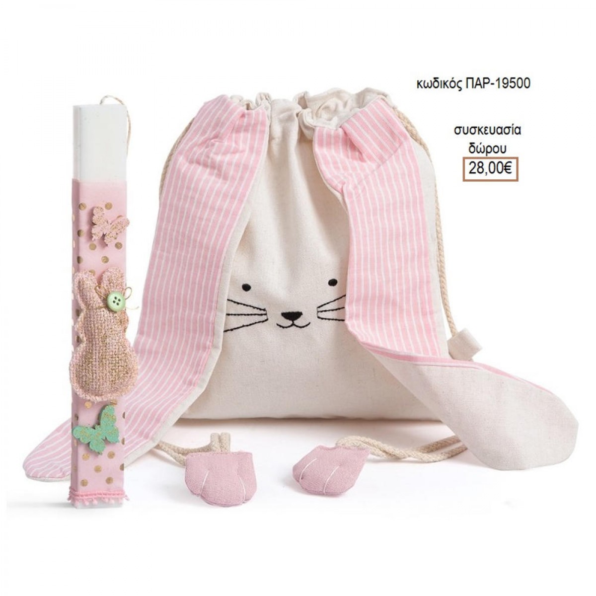 λαμπάδα διακοσμημένη με ύφασμα ροζ και χρυσό πουά και διακοσμητικό κουνελάκι από λινάτσα και υφασμάτινο σακίδιο backpack με σχέδιο κουνελάκι με ριγέ ροζ αυτιά.