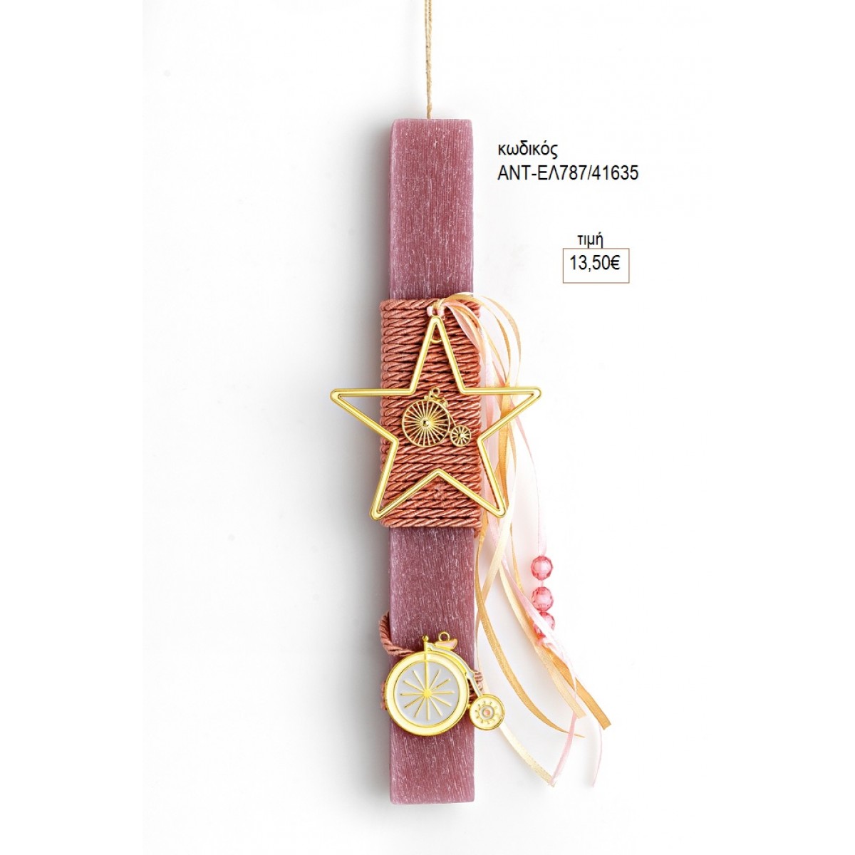 Η λαμπάδα είναι διακοσμημένη με μεταλλικά διακοσμητικά , μεταλλικό αστέρι , χάντρες και κορδέλες.