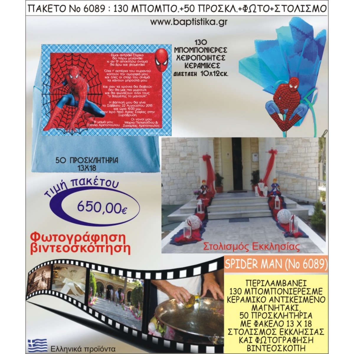 ΣΠΑΪΝΤΕΡΜΑΝ 650€ ΠΑΚΕΤΟ ΒΑΠΤΙΣΗΣ (130 ΜΠΟΜΠΟΝΙΕΡΕΣ,50 ΠΡΟΣΚΛΗΤΗΡΙΑ,ΣΤΟΛΙΣΜΟΣ ΕΚΚΛΗΣΙΑΣ,ΦΩΤΟΓΡΑΦΗΣΗ-ΒΙΝΤΕΟΣΚΟΠΗΣΗ) ΝΟ6089